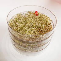 Kiełki z lucerny szczególnie polecam. To dobre źródłem żelaza i łatwo przyswajalnego białka. Mają wyjątkowy smak, świetnie i ładnie kiełkują. Można wyhodować je w słoiku, ale ja wolę w robić to w kiełkownicy. Dobrze jest pozwolić im wyrosnąć do wysokości 3-4 cm.