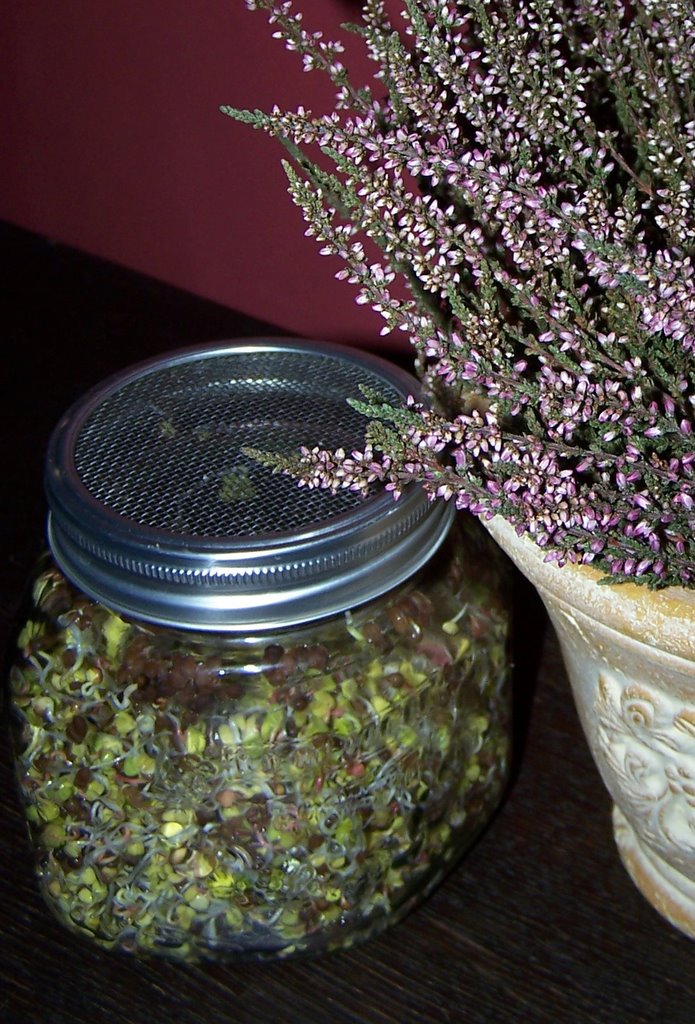 Wypróbowałam kilka metod otrzymywania kiełków. Najprostszym sposobem na kiełki jest zwykły słoik, do którego wkładamy nasionka (ok. 3 łyżek) i zalewamy je letnią wodą. Moczymy nasiona przez 12-36 godzin. Po tym czasie odcedzamy, płuczemy na sicie pod bieżącą wodą i zostawiamy ponownie w słoiku na 2-7 dni, każdego dnia rano i wieczorem przelewając wodą. Należy zawsze dobrze odcedzić pozostałość wody. Kiełki muszą mieć dostęp powietrza. Ważne jest, aby słoik nie stał bezpośrednio w słonecznym miejscu, raczej w lekko zacienionym, o temperaturze 18-25 st.C – to optymalna temperatura do ich wzrostu. Przed spożyciem kiełki wystawiamy do słońca na kilka godzin, w celu wytworzenia się w nich chlorofilu. Możemy je przechowywać w lodówce parę dni, w zamkniętym słoiku. Trzeba pamiętać, że nie każde nasiona wyhodujemy w słoiku. Te drobniejsze muszą być wysiane na ligninę na talerzu, albo do kiełkownicy piętrowej (o niej piszę poniżej).